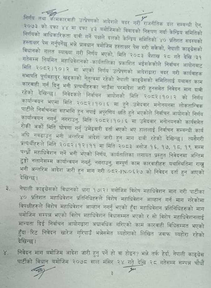 पूर्वसभापति देउवा र कार्यबाहक सभापति खड्काले माघ ४ गते निर्वाचन आयोगको निर्णय खारेज गर्न माग गर्दै वारेस मार्फत रिट दायर गरेका थिए।