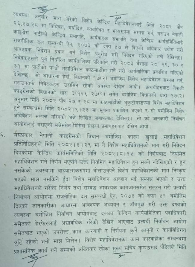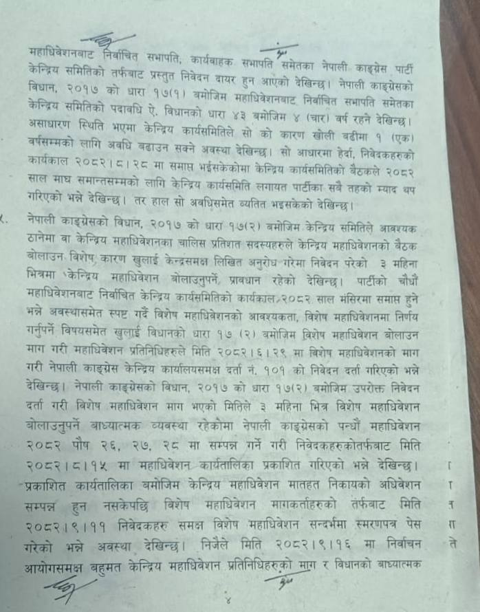 तर यहि बिचमा थापा नेतृत्वले कांग्रेसको नियमित महाधिवेशन असोज १६ गतेदेखि १९ गतेसम्ममा गर्ने घोषणा गरेको छ। यो निर्णयपछि देउवाले चैत २६ गते अर्को रिट दायर गर्दै यो महाधिवेशनको कार्यतालिका कार्यान्वयनमा रोक लगाउन माग गरेका थिए।