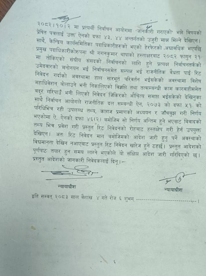 काठमाडौं, ४ वैशाख । नेपाली कांग्रेसको आधिकारीकता गगन थापा नेतृत्वको टिमलै नै पाएको छ।सर्वोच्च अदालतले शेरबहादुर देउवा र पूर्णबहादुर खड्काले दायर गरेको रिट खारेज गर्दै विशेष महाधिवेशनबाट चुनिएको थापा नेतृत्वको टिमलाई आधिकारीकता प्रदान गर्ने निर्वाचन आयोगको निर्णय सदर गरेको हो।