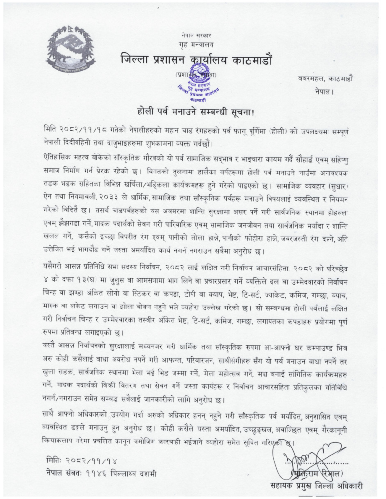 निर्वाचनको आचार संहिता र सुरक्षा संवेदनशीलताको कारण जनाउँदै प्रशासनले यस वर्षको होलीमा कडा प्रतिबन्धहरू लगाएको छ ।